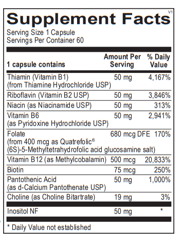 It is a balanced and comprehensive supplement that includes eight essential B vitamins, along with choline, inositol and folate as Quatrefolic® 100% 5-MTHF. The high-quality ingredients included help build a healthy micronutrient reserve to support energy production in the body.