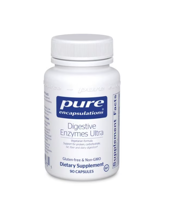 Digestive Enzymes Ultra contains an extensive profile of vegetarian digestive enzymes. Proteases included in this formula provide optimal activity across a wide pH range. They facilitate the normal breakdown of proteins and di- and tri-peptides. Lipase promotes lipid breakdown, while amylase and glucoamylase are included to stimulate polysaccharide breakdown of starch and glycogen. Invertase and lactase support the digestion of carbohydrate disaccharides, including the dairy sugar lactose. This formula also offers numerous enzymes to support fiber breakdown, including cellulase, hemicellulase, beta-glucanase, and phytase. These enzymes act to break down cell wall components and phytic acid, promoting nutrient bioavailability of fiber-containing foods. Additionally, alphagalactosidase promotes the breakdown of certain complex carbohydrates, such as raffinose and stachyose, found in some vegetables, grains, and legumes— helping to relieve occasional bloating or gas.*