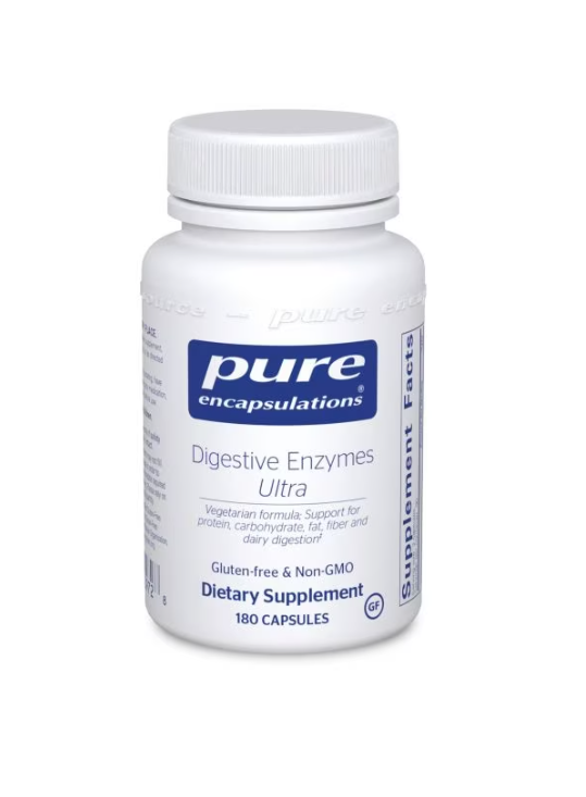 Digestive Enzymes Ultra contains an extensive profile of vegetarian digestive enzymes. Proteases included in this formula provide optimal activity across a wide pH range. They facilitate the normal breakdown of proteins and di- and tri-peptides. Lipase promotes lipid breakdown, while amylase and glucoamylase are included to stimulate polysaccharide breakdown of starch and glycogen. Invertase and lactase support the digestion of carbohydrate disaccharides, including the dairy sugar lactose. This formula also offers numerous enzymes to support fiber breakdown, including cellulase, hemicellulase, beta-glucanase, and phytase. These enzymes act to break down cell wall components and phytic acid, promoting nutrient bioavailability of fiber-containing foods. Additionally, alphagalactosidase promotes the breakdown of certain complex carbohydrates, such as raffinose and stachyose, found in some vegetables, grains, and legumes— helping to relieve occasional bloating or gas.*