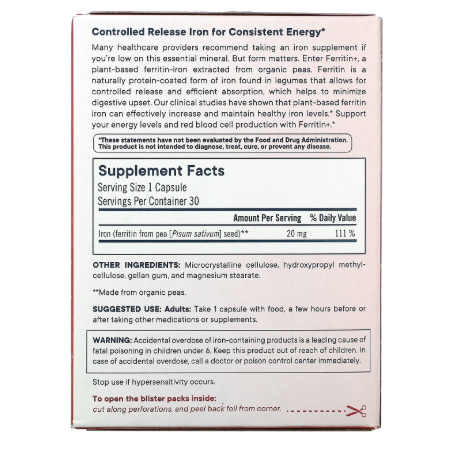 Many healthcare providers recommend taking an iron supplement if you are low on this essential mineral. But form matters. Enter Ferritin+, a plant-based ferritin-iron extracted from organic peas. Ferritin is a naturally protein-coated form of iron found in legumes that allows for controlled release and efficient absorption, which helps to minimize digestive upset. Clinical studies have shown that plant-based ferritin iron can help effectively increase and maintain healthy iron levels.* Support energy levels and red blood cell production with Ferritin+.*