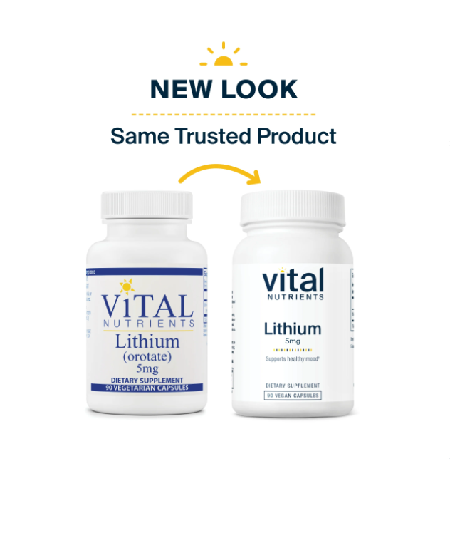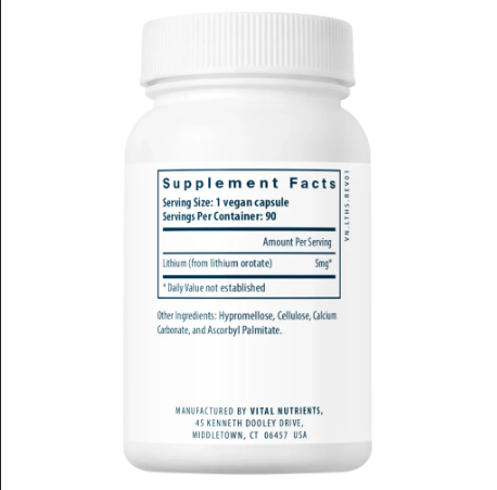 "• Supports healthy neurotransmitter activity* • Enhances Vitamin B12 and Folate transport into L1210 brain cells* • May support mental and behavioral health* • Premium Vegan Formulation Lithium is an alkali metal found in trace amounts of most rocks, as well as mineral springs, ocean water, and nearly all vertebrate tissue.* Vital Nutrients offers low-dose lithium supplied as lithium orotate, a bioavailable salt. Lithium supports the phosphoinositol pathway. Lithium may be used to promote a healthy balanced mood and behavior* Additionally, Lithium may help resist both the mental and physical effects of stress.*