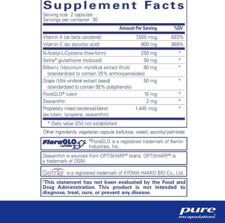 Combined with these cofactors, grape seed extract helps provide antioxidant balance in the retina. This formula is also enhanced with lutein and zeaxanthin, the only two carotenoids found in macular pigment. Lutein and zeaxanthin promote the integrity and density of the macular pigment, as well as helps maintain the health of the optical lens. The antioxidant activity of carotenoids and vitamin C provide optimal macular protection and ocular health.*