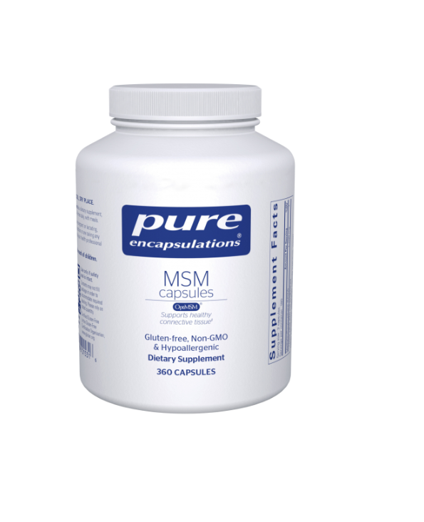 Pure Encapsulations' MSM (methylsulfonylmethane or dimethylsulfone) is a source of organic sulfur found naturally in the human body. MSM, the major metabolite of DMSO (dimethyl sulfoxide), is 34% elemental sulfur, a compound that is crucial in maintaining healthy tissues. While sulfur supports many functions, it is well known for maintaining connective tissue health. Sulfur also supports tissue containing significant amounts of collagen and keratin, including hair, skin, and nails. Sulfur is essential in methionine, cysteine and serum protein metabolism. Preliminary evidence suggests that MSM may also provide potential support for healthy immune and respiratory function.*