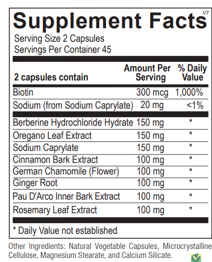 Formulated with the goal of building a healthy gastrointestinal (GI) flora, this includes biotin, a nutrient that inhibits yeast from converting into the more aggressive fungal form. In addition, sodium caprylate is included to disrupt the metabolism of Candida and create a hostile environment for colonization. It also includes potent botanicals, such as berberine HCl, pau d’arco, oregano, rosemary, cinnamon and ginger, to sooth the GI tract, provide potent antioxidant support, and ensure microbial balance.