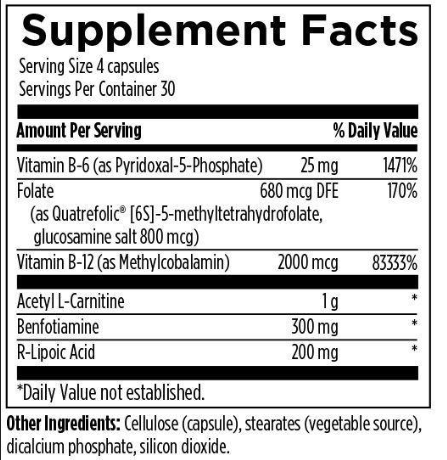 NeuroRenew™ is a comprehensive formula designed to support healthy nerve function. It contains lipoic acid, a potent antioxidant, and several members of the B vitamin family, including B1 (as benfotiamine), B6, B12, and folate. Acetyl L-carnitine is also included in this formula, as it supports brain health and promotes the production of acetylcholine, an important neurotransmitter that works to regulate communication between nerves and muscles.*