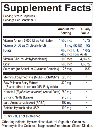 It provides several essential vitamins, minerals and phytonutrients needed to support healthy skin, hair and nails. Also provides betaine HCl, which helps to promote efficient digestion and assimilation of proteins and minerals necessary for hair and nail health. It includes MSM, which provides a bioavailable source of sulfur, for connective tissue integrity. Saw palmetto is added to support normal levels of DHT, known to play a role in the thickness and health of hair. In addition, silica (from horsetail grass extract) is included for its collagen-enhancing properties. Each serving contains 100 mg betaine HCl, 320 mg of saw palmetto and 325 mg MSM. Added support from vitamin A, vitamin D3, folic acid, vitamin B12, biotin and selenium provide a full spectrum of skin, hair and nail support.