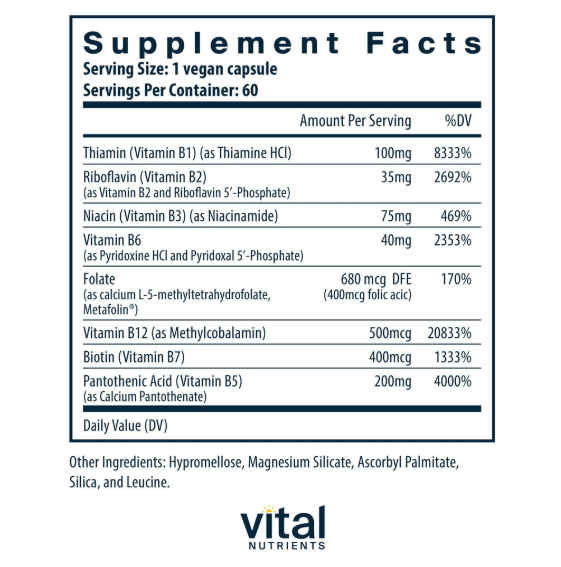 • Premium Vegan Formulation B-Complex is used in the metabolism of protein and fats, helps maintain muscle tone in the gastrointestinal tract and helps convert carbohydrates into energy.