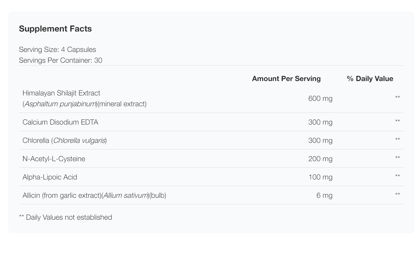 EDTA Plus is designed to help the body rid itself of damaging oxidative elements. It features specialized ingredients, such as EDTA, Himalayan shilajit extract, chlorella, and antioxidant-stimulating nutrients. These ingredients perform in concert to support your health when your body is challenged by environmental toxins, such as heavy metals.*