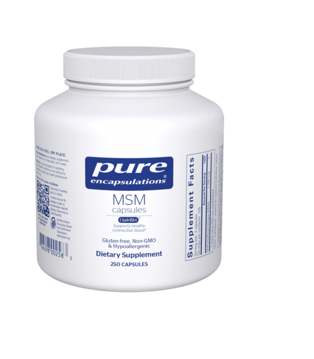 Pure Encapsulations' MSM (methylsulfonylmethane or dimethylsulfone) is a source of organic sulfur found naturally in the human body. MSM, the major metabolite of DMSO (dimethyl sulfoxide), is 34% elemental sulfur, a compound that is crucial in maintaining healthy tissues. While sulfur supports many functions, it is well known for maintaining connective tissue health. Sulfur also supports tissue containing significant amounts of collagen and keratin, including hair, skin, and nails. Sulfur is essential in methionine, cysteine and serum protein metabolism. Preliminary evidence suggests that MSM may also provide potential support for healthy immune and respiratory function.*