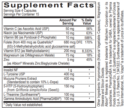 It is formulated to support a positive mental outlook and a relaxed, focused state. It includes amino acid precursors and bioactive nutrients that support healthy levels of neurotransmitters such as gamma-aminobutyric acid (GABA), serotonin, dopamine, norepinephrine and epinephrine. Maintaining adequate neurotransmitter production is vital for regulating mood, appetite, memory, focus, energy levels and a healthy sleep cycle.