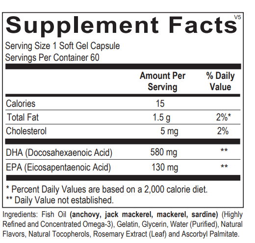 It is a high-concentration docosahexaenoic acid (DHA) fish oil formula for those needing intensive nutritional support from this essential fatty acid. DHA, or docosahexaenoic acid, is a fatty acid well-known for its role in cardiovascular and cognitive health, as well as in supporting mood, memory and focus. It is sourced from waters off the Chilean coast, where cold, fresh waters provide the cleanest, most sustainable source of fish in the world. Each soft gel delivers 580 mg DHA in the natural triglyceride form for superior absorption.