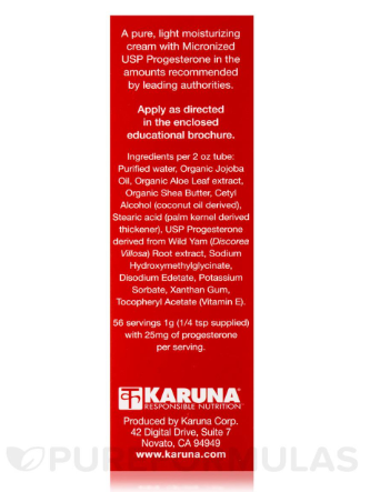 Karuna Progesterone Pure is free of alcohol, parabens and urea. Each 2 oz. tube is standardized, quality controlled and safety-sealed to prevent oxidation and bacterial contamination. Each 2 oz. tube contains natural progesterone USP (25 mg per ¼ tsp.), which applies easily and absorbs rapidly into the skin, leaving no sticky or oily residue.